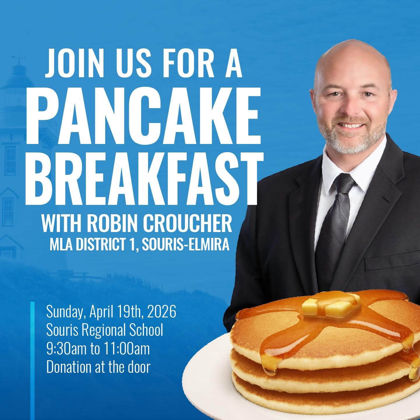 Join MLA Robin Croucher for a District 1 Pancake Breakfast on April 19th, 2026 from 9:30 am - 11:00 am at the Souris Regional High School. Admission is by donation.